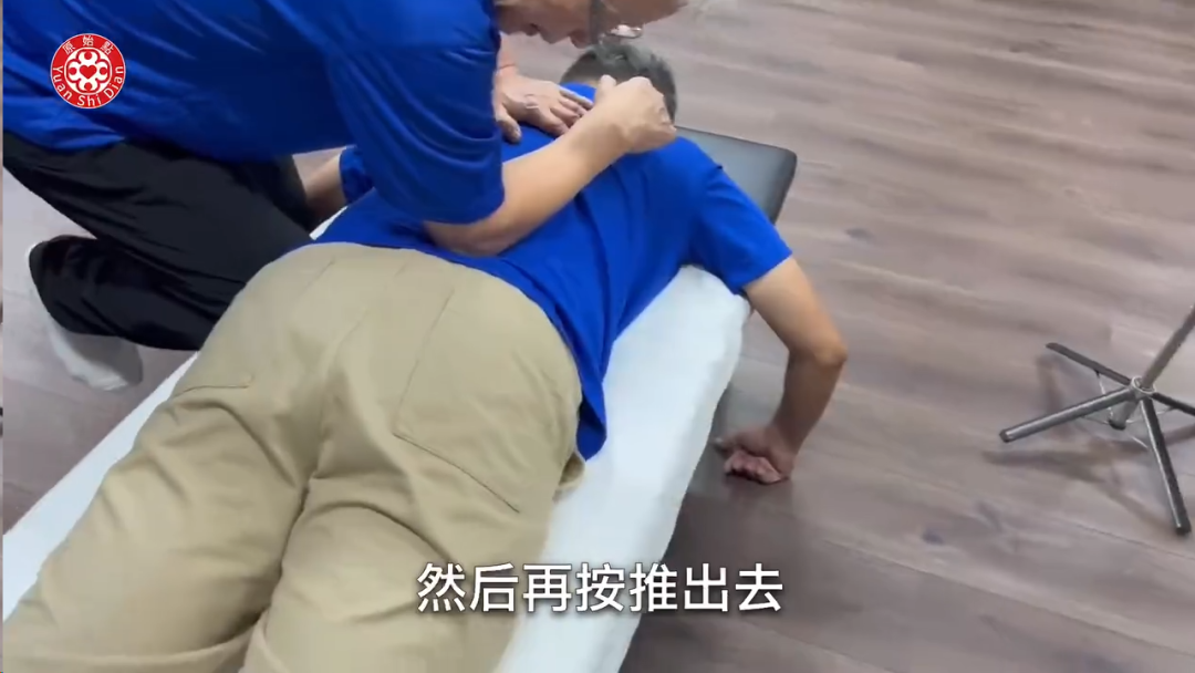 按推右侧用右手+右脚跪姿,左侧反之,避免力道分散(张医师现场演示)。