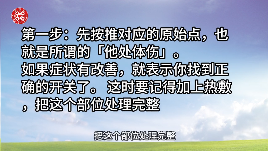 1. **第一步**:先按推对应的原始点(他处体伤)。如果症状有改善,就表示你找到正确的开关了。这时要记得加上热敷,把这个部位处理完整。