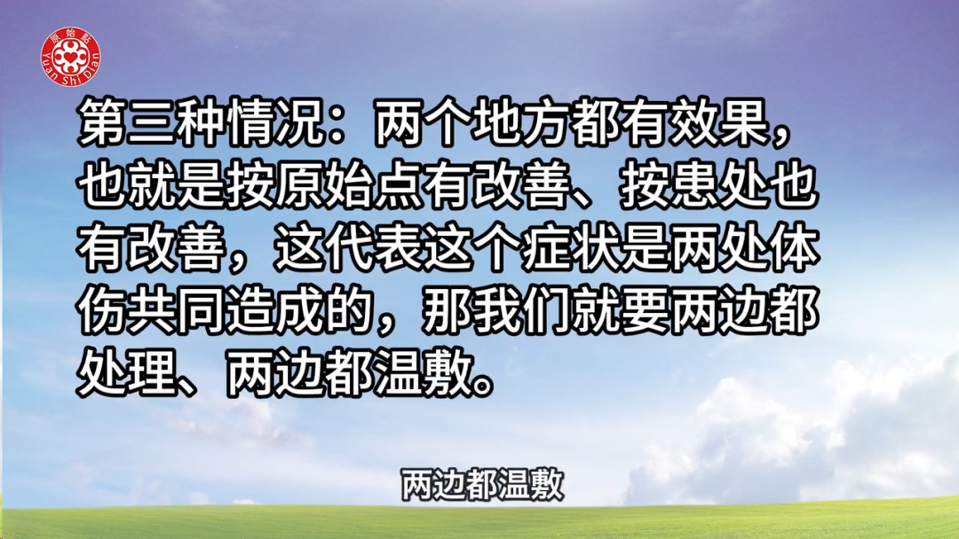 3. **第三种情况**:两个地方都有效果,即按原始点和按患处都有改善,这代表症状是由两处体伤共同造成的。那么我们就两边都要处理,两边都要温敷。