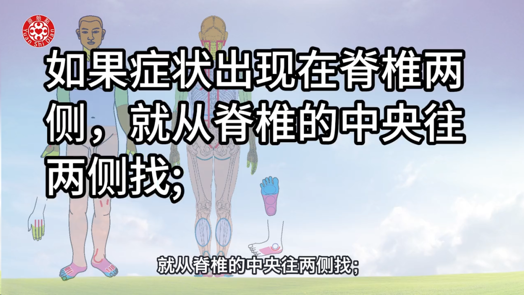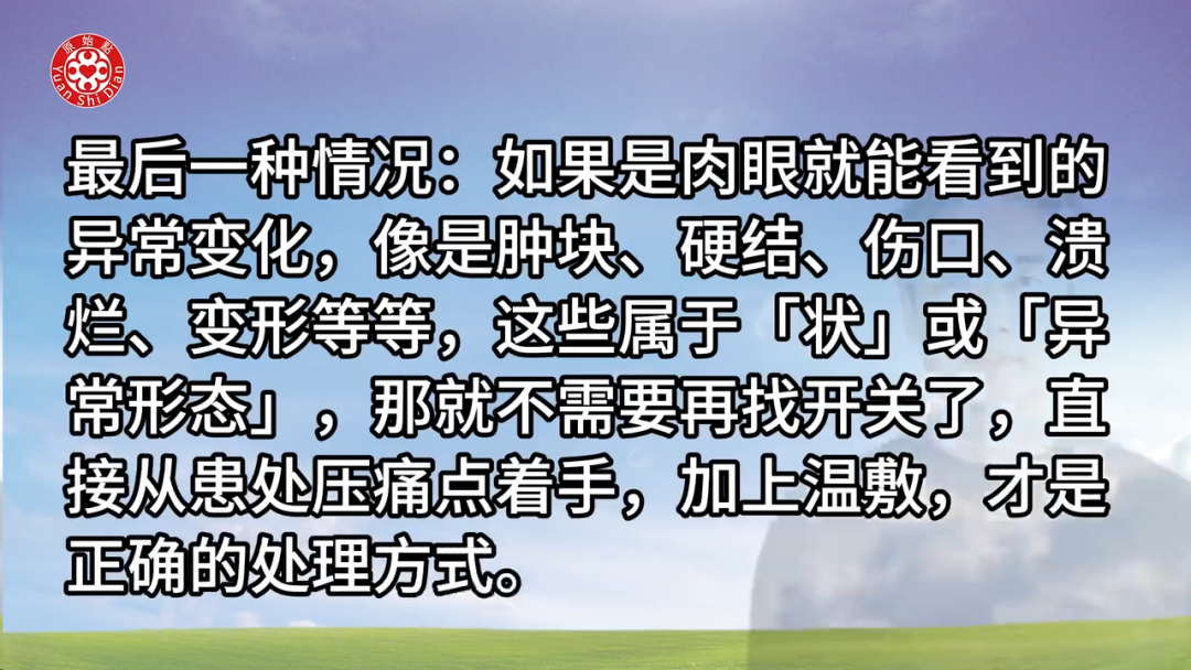 4. **最后一种情况**:如果是肉眼能看到的异常变化,如肿块、硬结等,这些属于状或异常形态,不需要再找开关,直接从患处压痛点着手,加上温敷才是正确的处理方式。