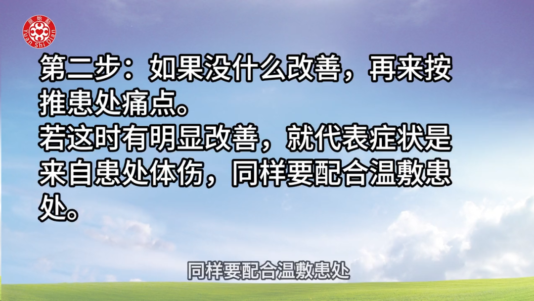 2. **第二步**:如果没什么改善,再来按推患处痛点。若这时有明显改善,就代表症状是来自患处体伤。同样要配合温敷患处。