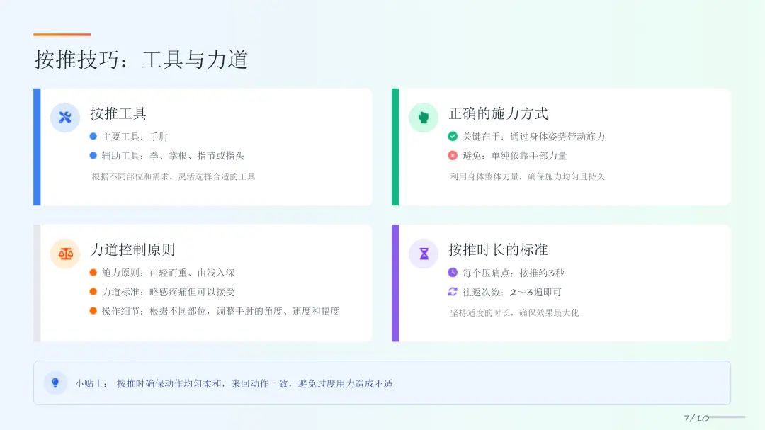 - **发力原则**:身体带动手肘,非蛮力!力道=「微痛可忍」⚠️
