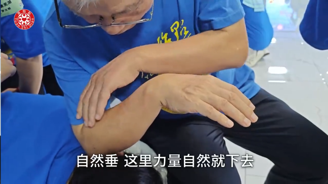 对 你们都看清楚 所以我一再讲 不是要深层 你们就这一使劲在这一手 反而这样 我的身体调控下来 整个身体压在这一点 然后手还是轻松 然后我这一手为什么还要扶著 扶著是固定他但已经不用力 那所有的力量都跑到这里来