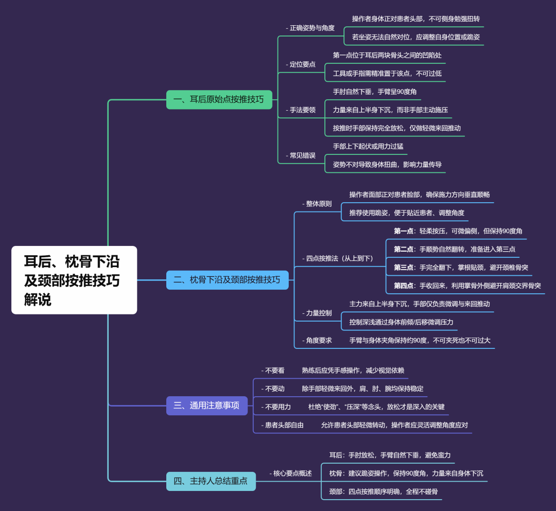 2025年8月24日张医师的线上课程主要围绕耳后、枕骨和颈部的按推技巧进行了解说。张医师在课程中强调了手法的优化,特别是在姿势和角度上的调整,以确保按推的效果。以下是课程的重点总结: