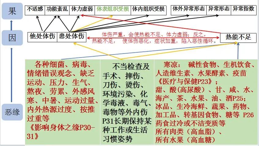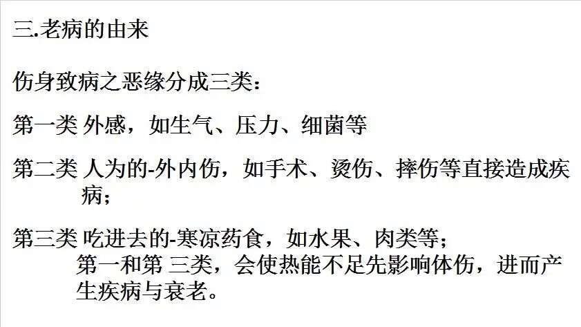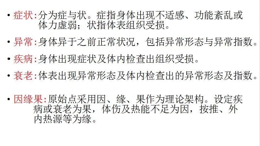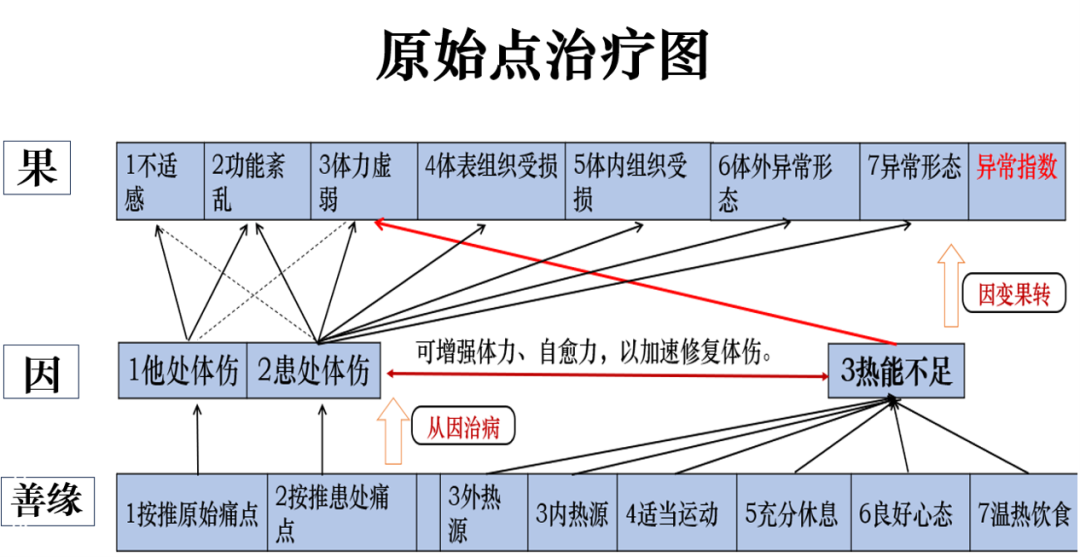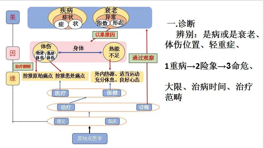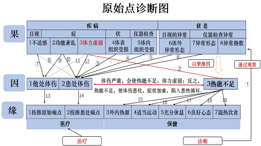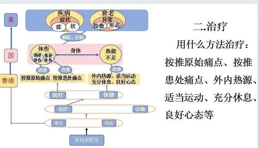 原始点医学在理论上,认为老病是果,体伤与热能不足为因, 影响身体的各种因素为缘。