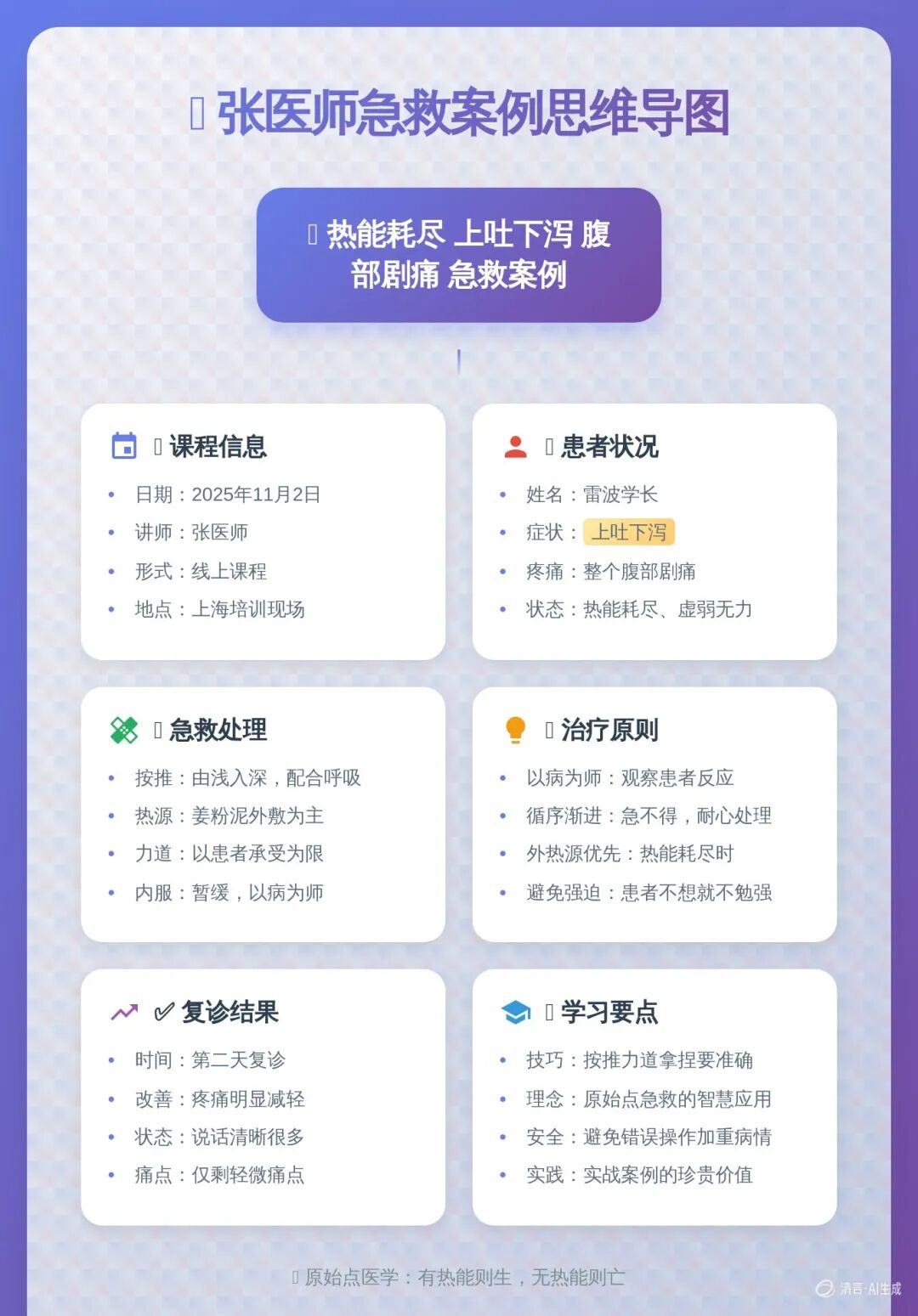 👋 **(00:01)** 原始点的家人们大家好!👋 欢迎参加2025年11月2号张医师的线上课程!🎉 今天的主题是张医师在上海培训时的现场急救案例:热能耗尽、上吐下泻、腹部剧痛案例!🆘 这是一个非常难得又真实的实战案例,现在就让我们一起观看张医师怎么样把命危的状况化险为夷!✨