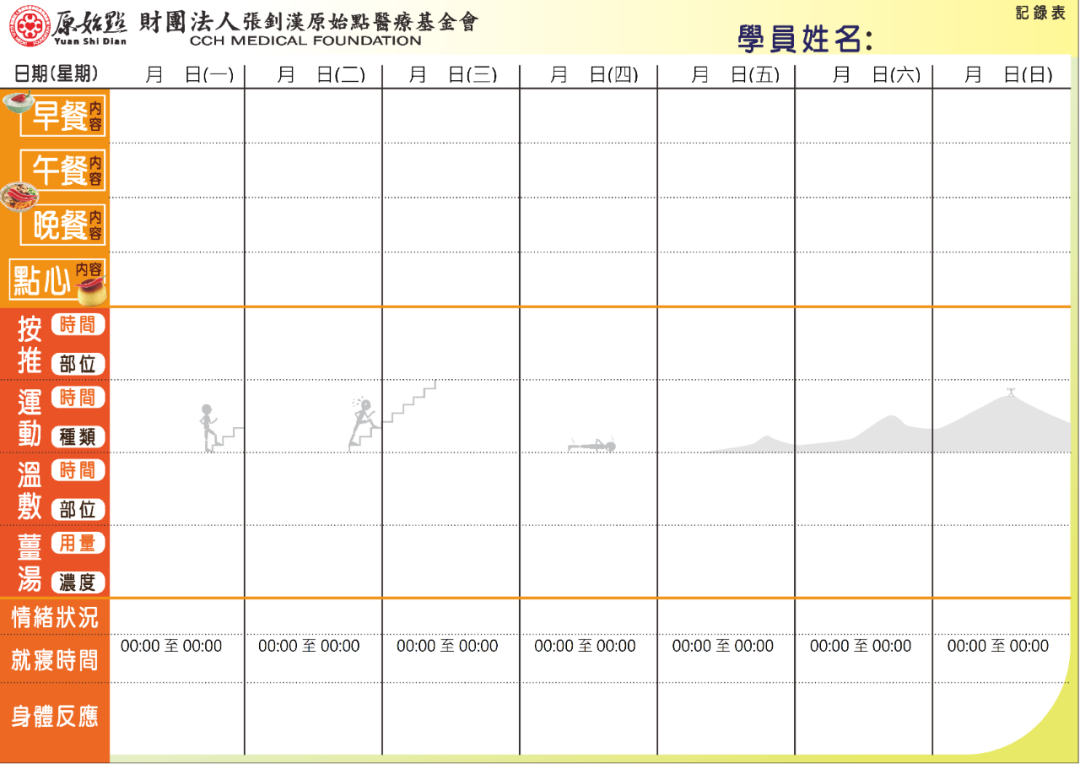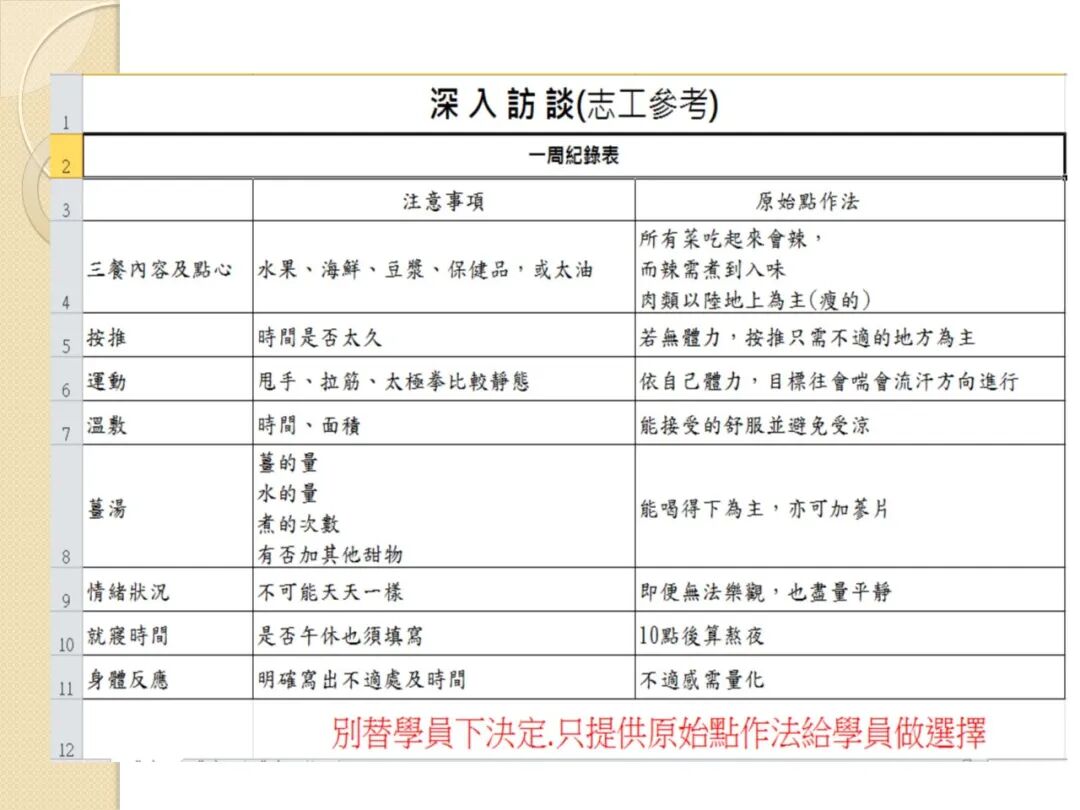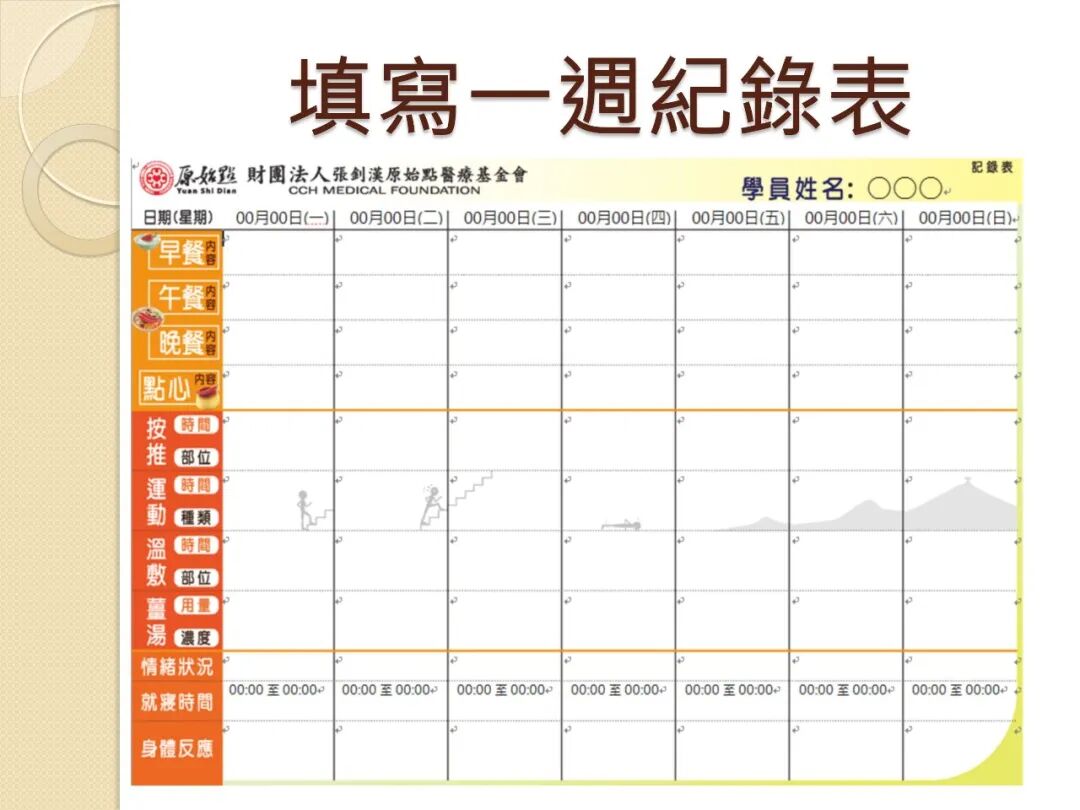 :学员每日记录数据,用于深入访谈时分析进展。记录表模板包括: - 饮食