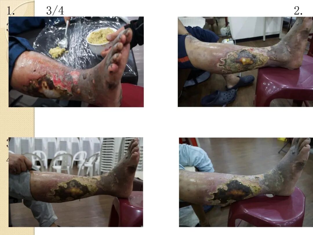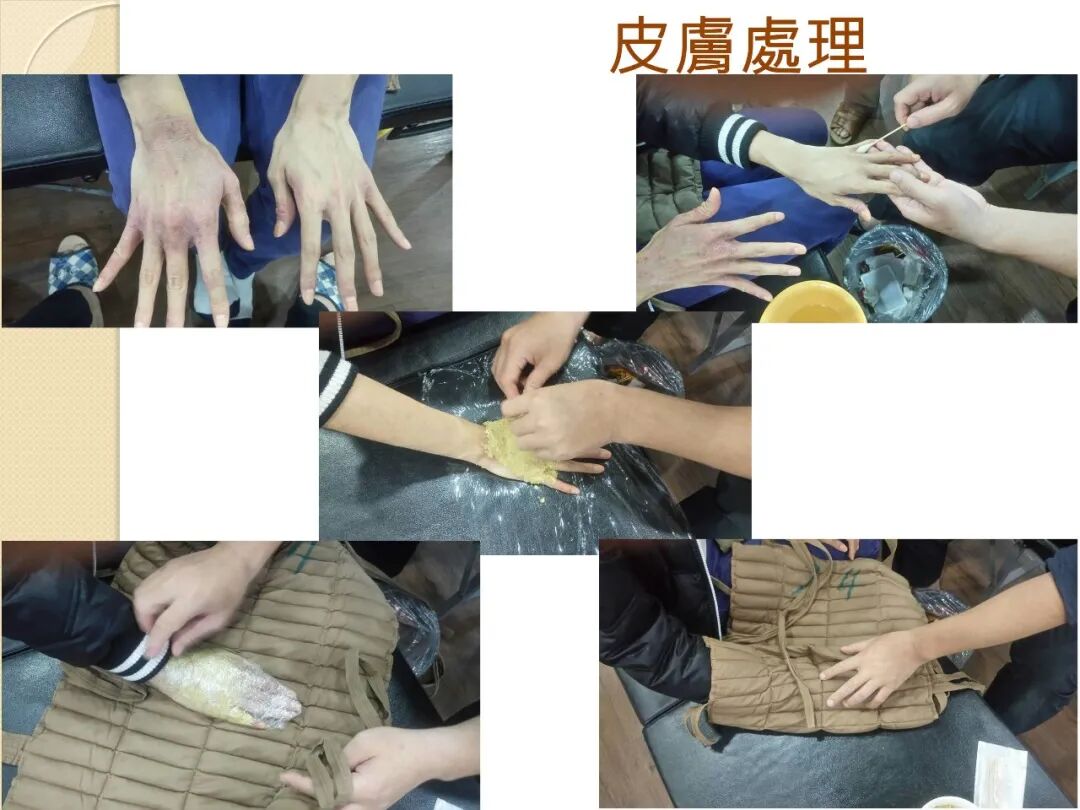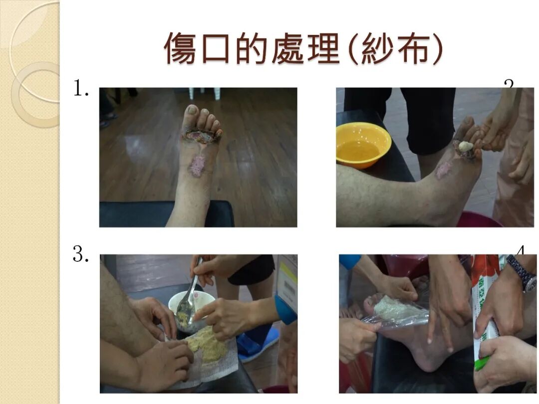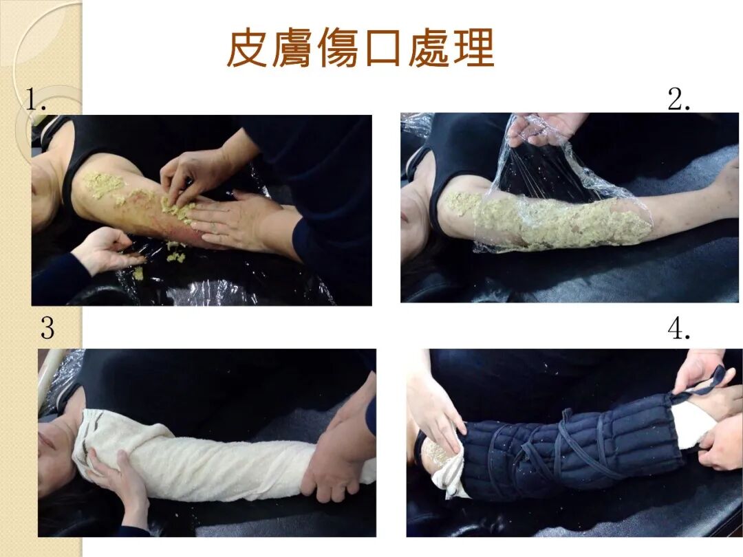 :针对皮肤伤口,使用纱布和姜泥等方法,强调温和处理,避免感染。示例展示了伤口愈合过程(如3/4、3/11、3/15的进展)。