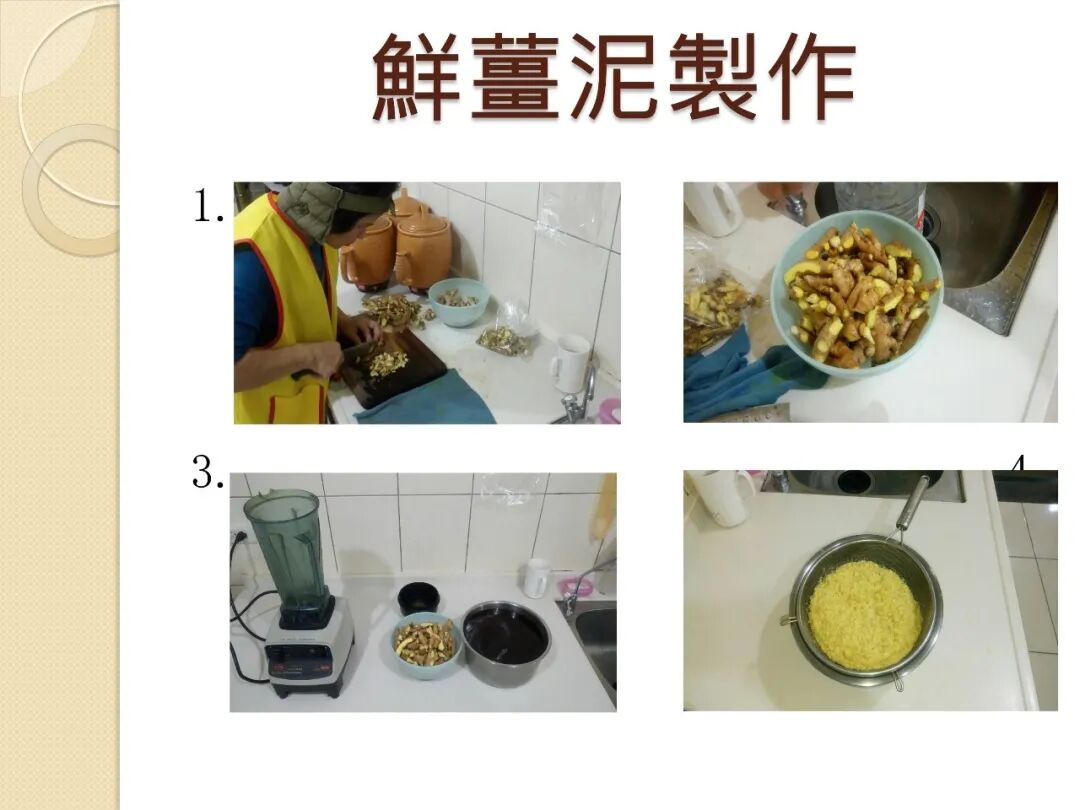 :步骤包括姜量、水量控制,煮多次以提取有效成分。 - 姜粉制作