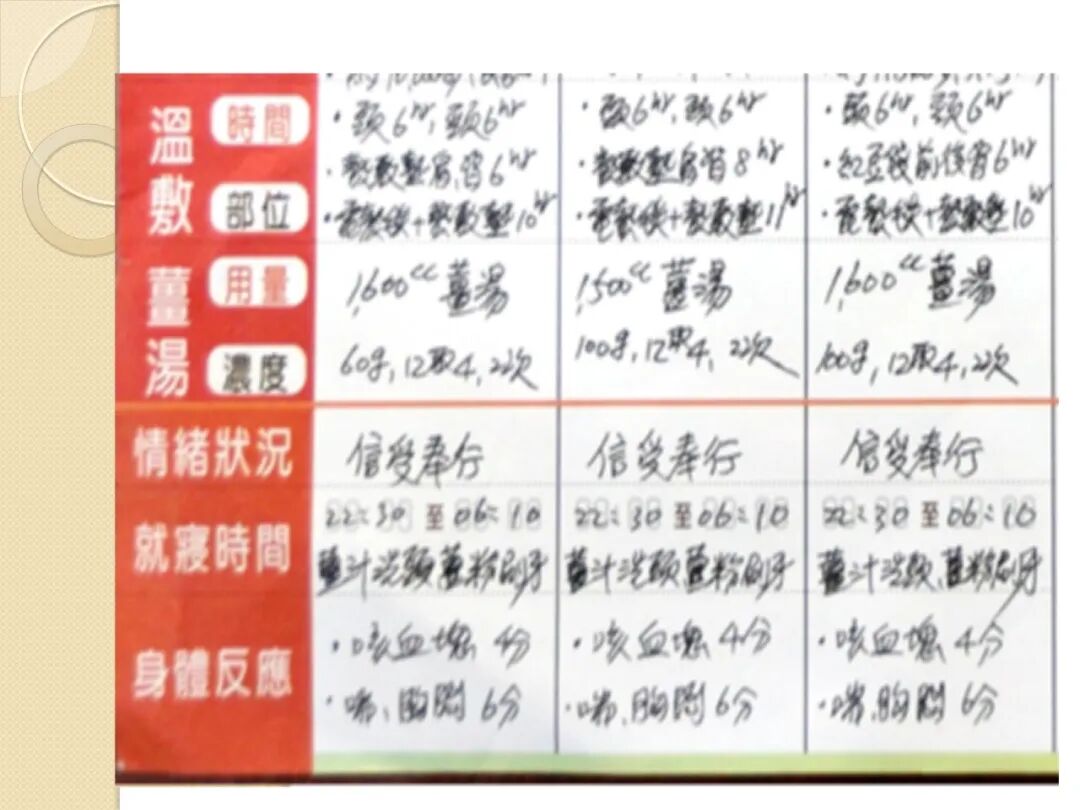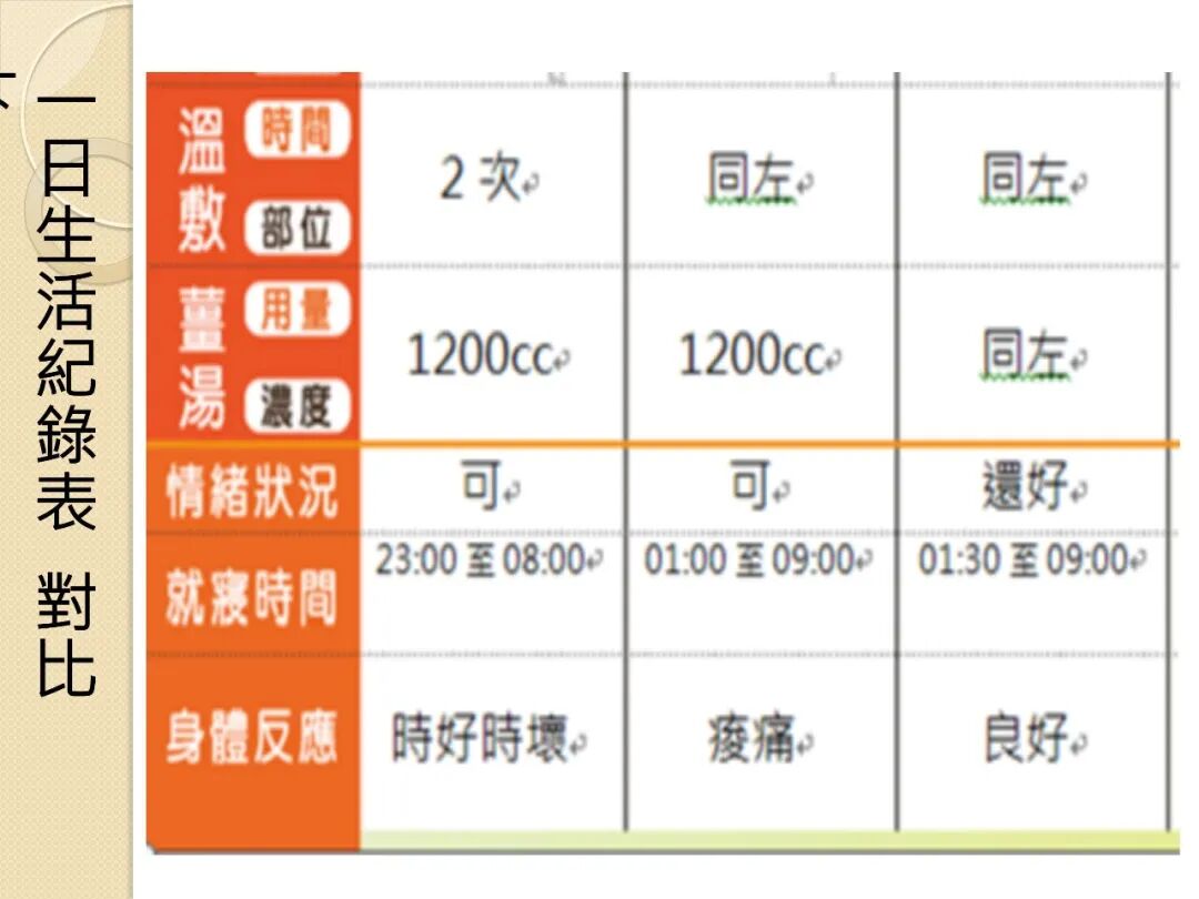 :种类和时间(如走路、拉筋、太极拳,目标为会喘会流汗)。 - 温敷