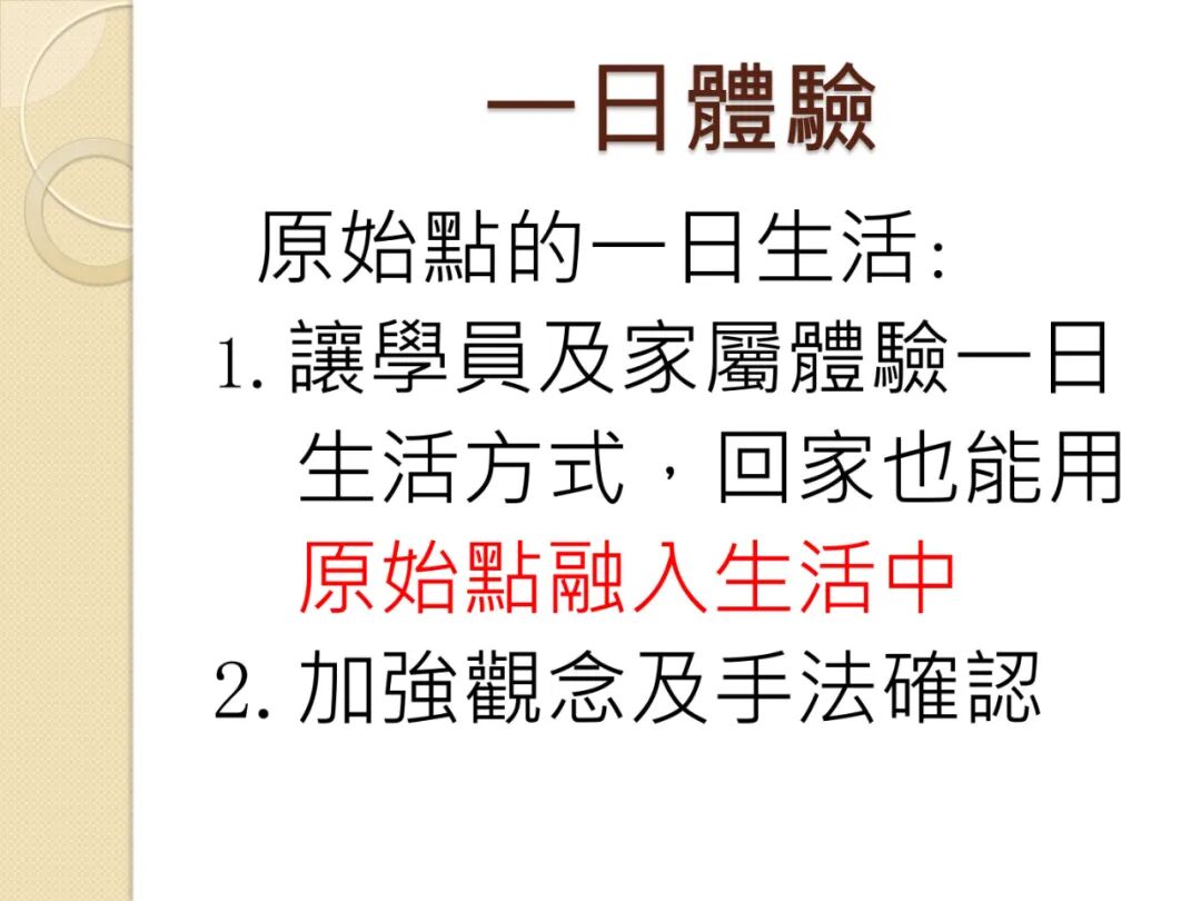 :让学员及家属体验原始点融入日常生活的方式,回家后也能应用。 - 内容