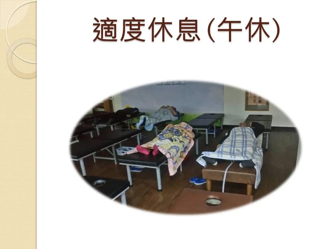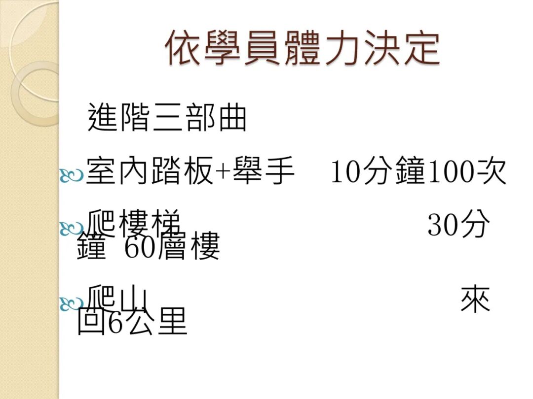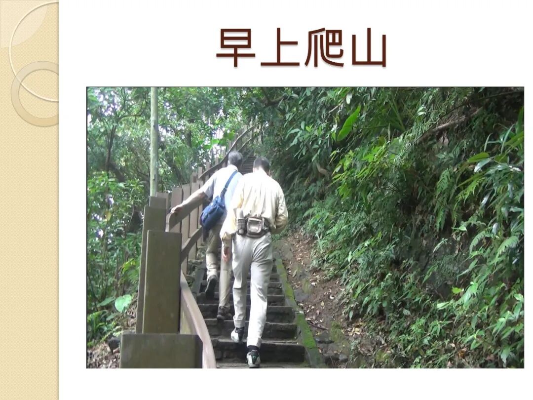 :包括温热早餐、有氧运动(如爬山、踏阶)、午休、观念加强、心得讨论、手法修正等。 - 体力评估