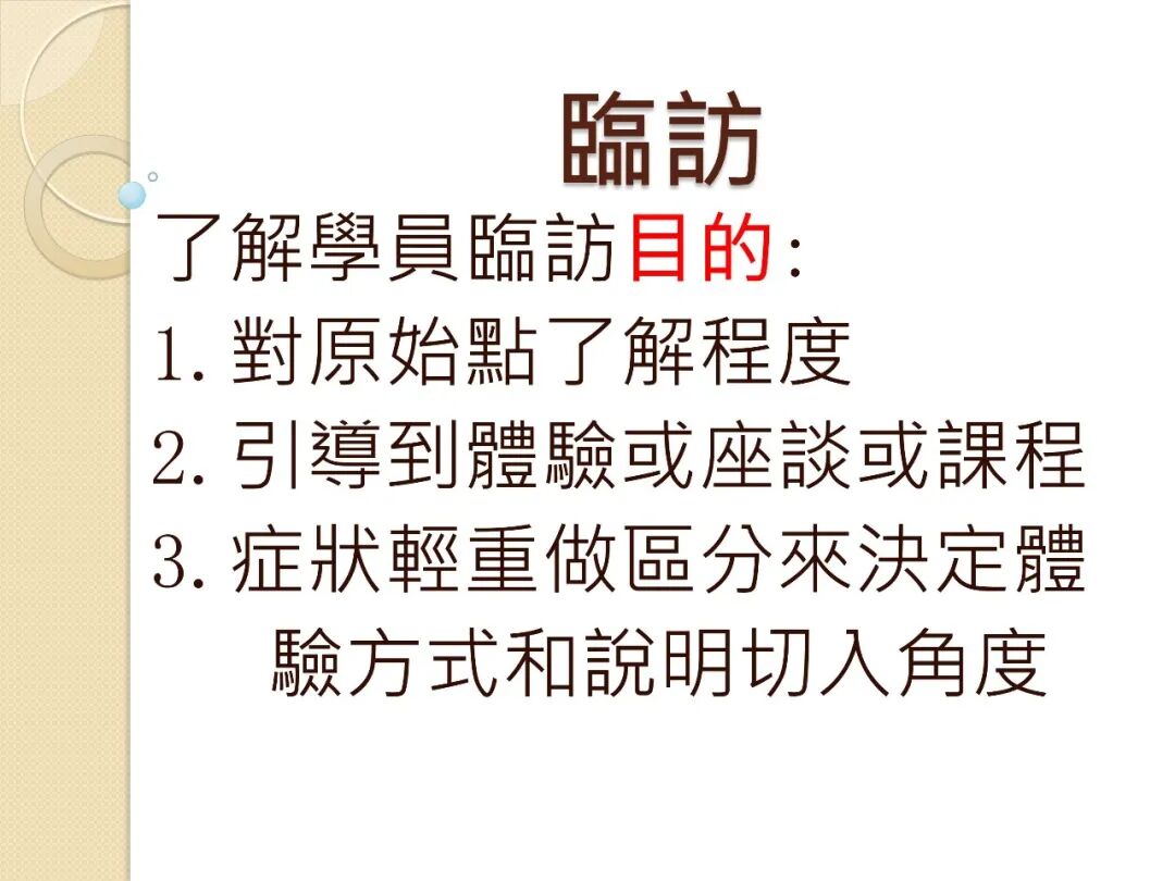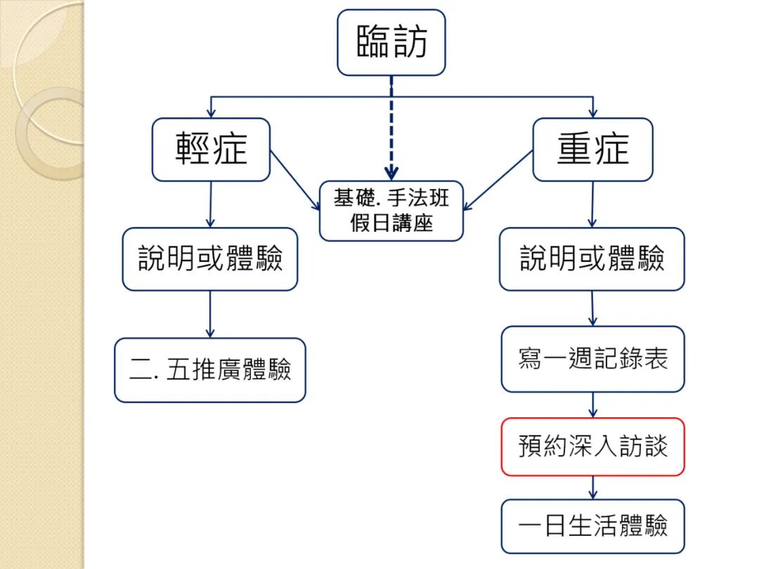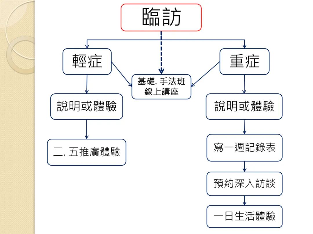 区分学员症状(轻症、重症),决定体验方式(如说明会、手法体验)。 -