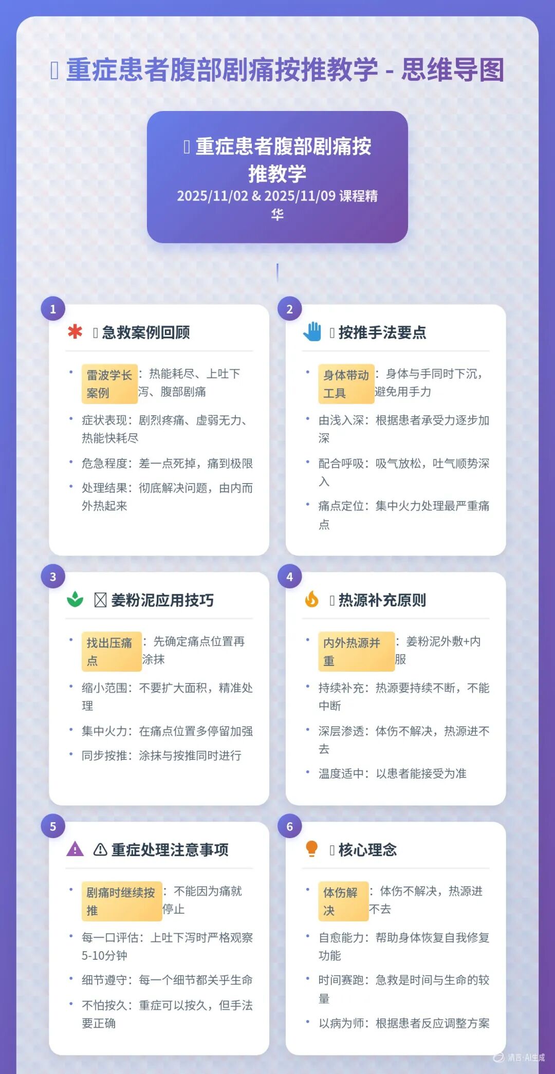 - 🔥 **热源与按推的结合**:指出在处理重症患者时,热源与按推应同步进行,以帮助患者更好地缓解症状,促进自我修复。