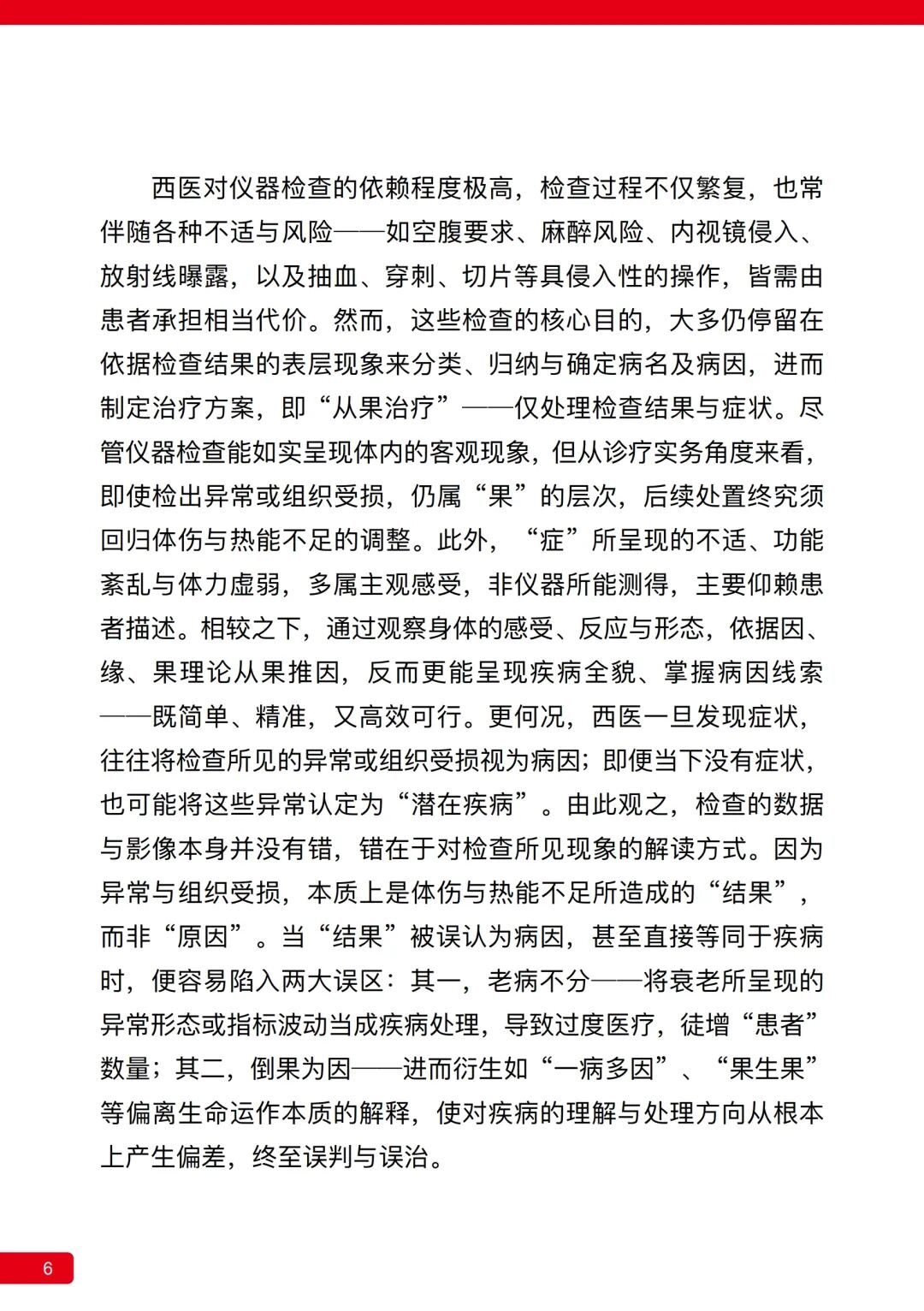 西医对仪器检查的依赖程度极高,检查过程不仅繁复,也常伴随各种不适与风险──如空腹要求、麻醉风险、内视镜侵入、放射线曝露,以及抽血、穿刺、切片等具侵入性的操作,皆需由患者承担相当代价。。然而,这些检查的核心目的,大多仍停留在依据检查结果的表层现象来分类、归纳与确定病名及病因,进而制定治疗方案,即“从果治疗”──仅处理检查结果与症状。尽管仪器检查能如实呈现体内的客观现象,但从诊疗实务角度来看,即使检出异常或组织受损,仍属“果”的层次,后续处置终究须回归体伤与热能不足的调整。此外,“症”所呈现的不适、功能紊乱与体力虚弱,多属主观感受,非仪器所能测得,主要仰赖患者描述。