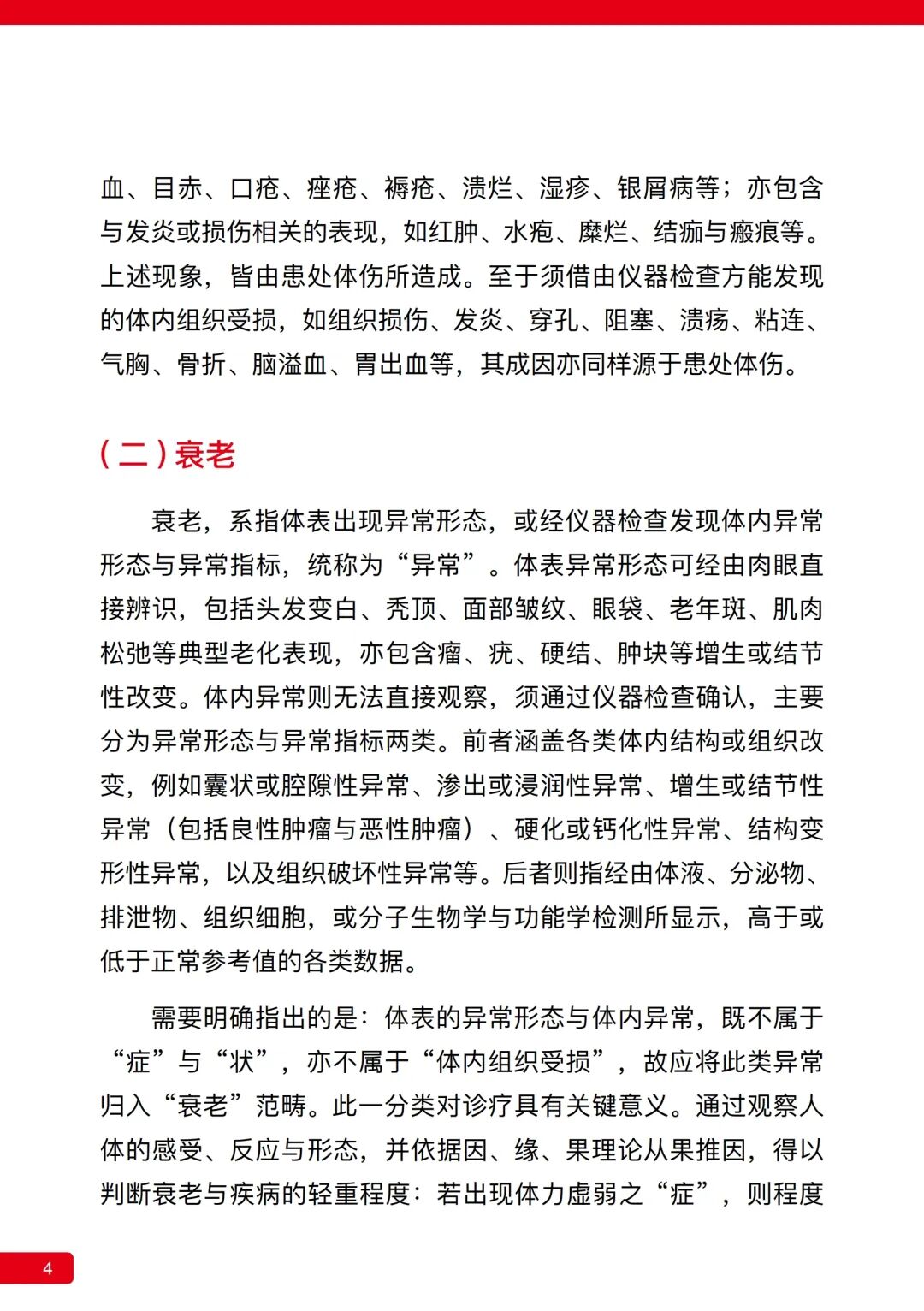 需要明确指出的是:体表的异常形态与体内异常,既不属于“症”与“状”,亦不属于“体内组织受损”,故应将此类异常归入“衰老”范畴。