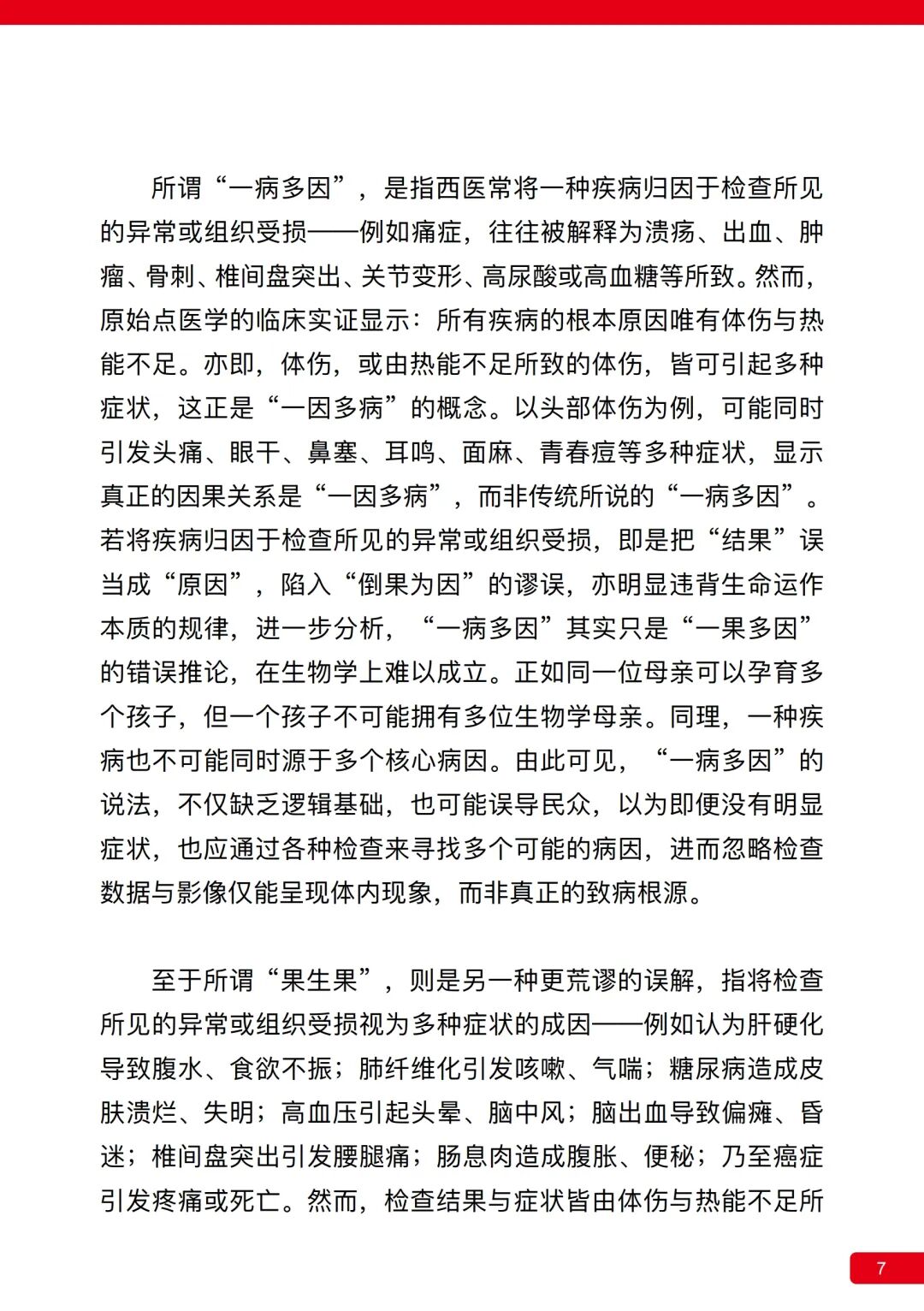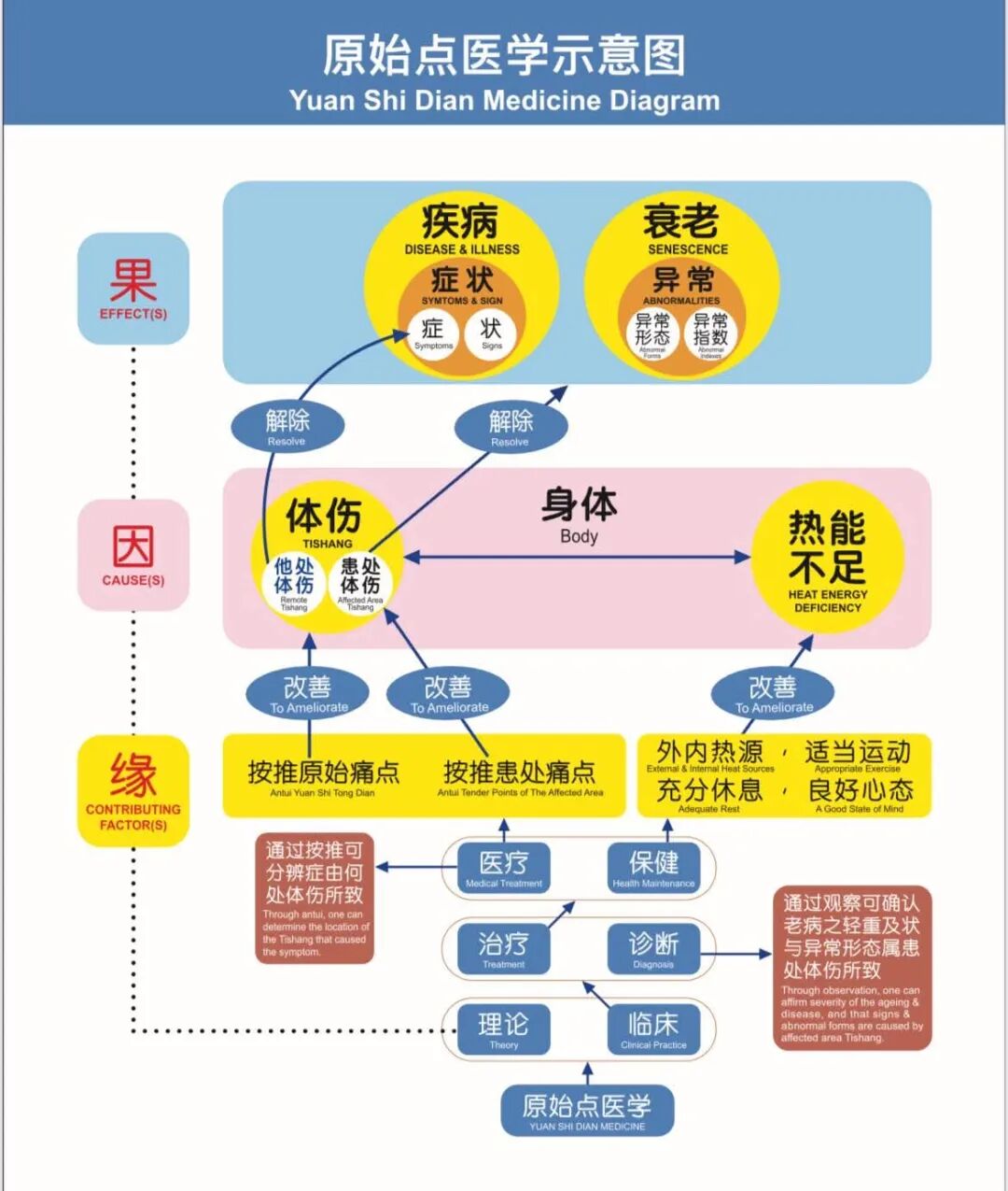 然而,原始点医学的临床实证显示:所有疾病的根本原因唯有体伤与热能不足。亦即,体伤,或由热能不足所致的体伤,皆可引起多种症状,这正是“一因多病”的概念。