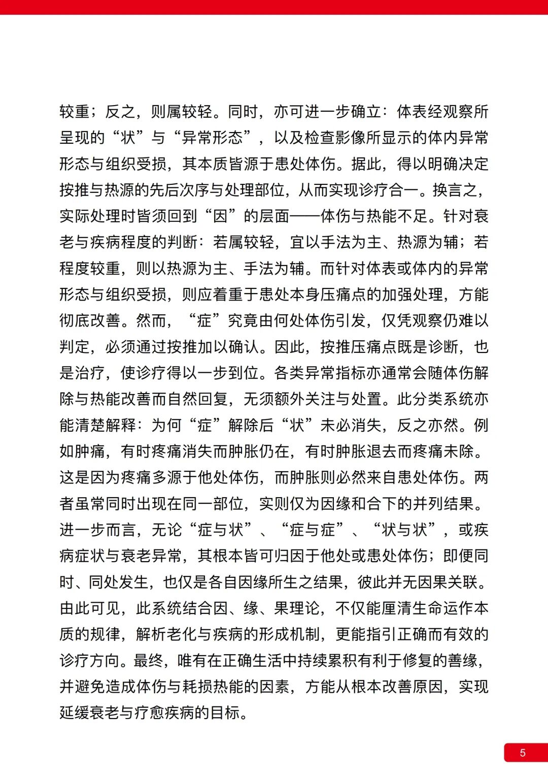 进一步而言,无论“症与状”、“症与症”、“状与状”,或疾病症状与衰老异常,其根本皆可归因于他处或患处体伤;即便同时、同处发生,也仅是各自因缘所生之结果,彼此并无因果关联。