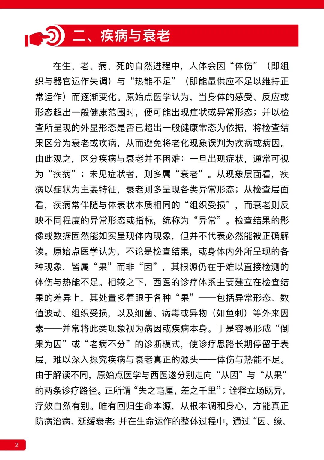 相较之下,西医的诊疗体系主要建立在检查结果的差异上,其处置多着眼于各种“果”——包括异常形态、数值波动、组织受损,以及细菌、病毒或异物(如鱼刺)等外来因素——并常将此类现象视为病因或疾病本身。于是容易形成“倒果为因”或“老病不分”的诊断模式,使诊疗思路长期停留于表层,难以深入探究疾病与衰老真正的源头——体伤与热能不足。