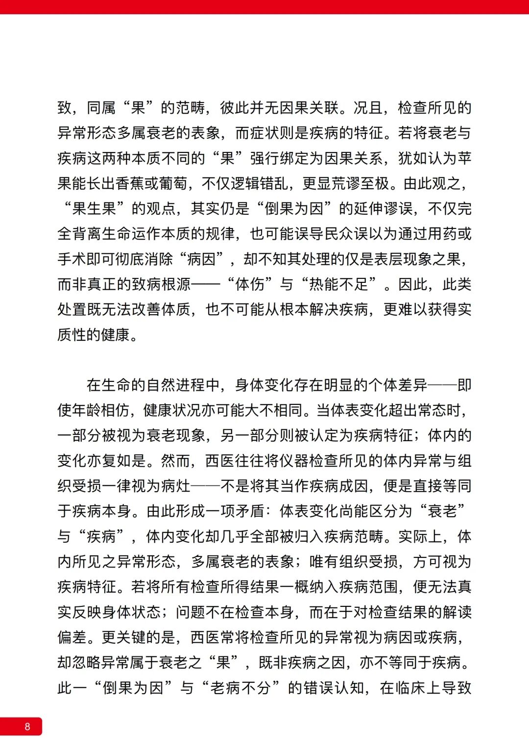 然而,检查结果与症状皆由体伤与热能不足所致,同属“果”的范畴,彼此并无因果关联。况且,检查所见的异常形态多属衰老的表象,而症状则是疾病的特征。若将衰老与疾病这两种本质不同的“果”强行绑定为因果关系,犹如认为苹果能长出香蕉或葡萄,不仅逻辑错乱,更显荒谬至极。由此观之,“果生果”的观点,其实仍是“倒果为因”的延伸谬误,不仅完全背离生命运作本质的规律,也可能误导民众误以为通过用药或手术即可彻底消除“病因”,却不知其处理的仅是表层现象之果,而非真正的致病根源——“体伤”与“热能不足”。因此,此类处置既无法改善体质,也不可能从根本解决疾病,更难以获得实质性的健康。