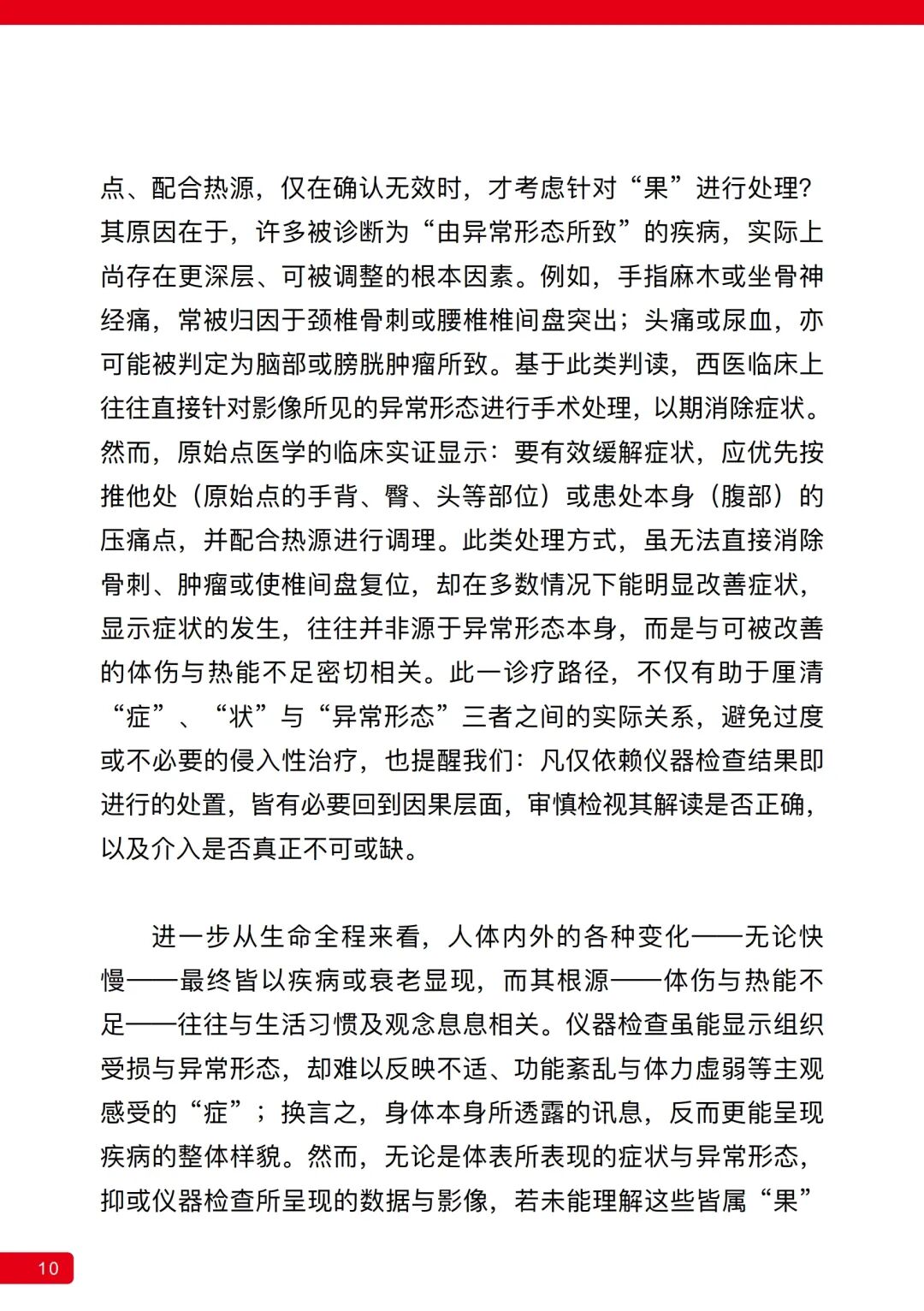 基于此类判读,西医临床上往往直接针对影像所见的异常形态进行手术处理,以期消除症状。然而,原始点医学的临床实证显示:要有效缓解症状,应优先按推他处(原始点的手背、臀、头等部位)或患处本身(腹部)的压痛点,并配合热源进行调理。此类处理方式,虽无法直接消除骨刺、肿瘤或使椎间盘复位,却在多数情况下能明显改善症状,显示症状的发生,往往并非源于异常形态本身,而是与可被改善的体伤与热能不足密切相关。此一诊疗路径,不仅有助于厘清“症”、“状”与“异常形态”三者之间的实际关系,避免过度或不必要的侵入性治疗,也提醒我们:凡仅依赖仪器检查结果即进行的处置,皆有必要回到因果层面,审慎检视其解读是否正确,以及介入是否真正不可或缺。