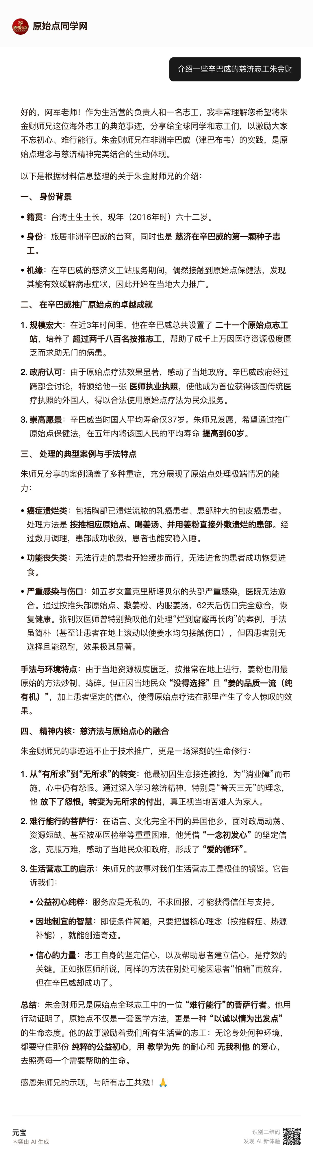 作为生活营的负责人和一名志工,我非常理解您希望将朱金财师兄这位海外志工的典范事迹,分享给全球同学和志工们,以激励大家不忘初心、难行能行。朱金财师兄在非洲辛巴威(津巴布韦)的实践,是原始点理念与慈济精神完美结合的生动体现。