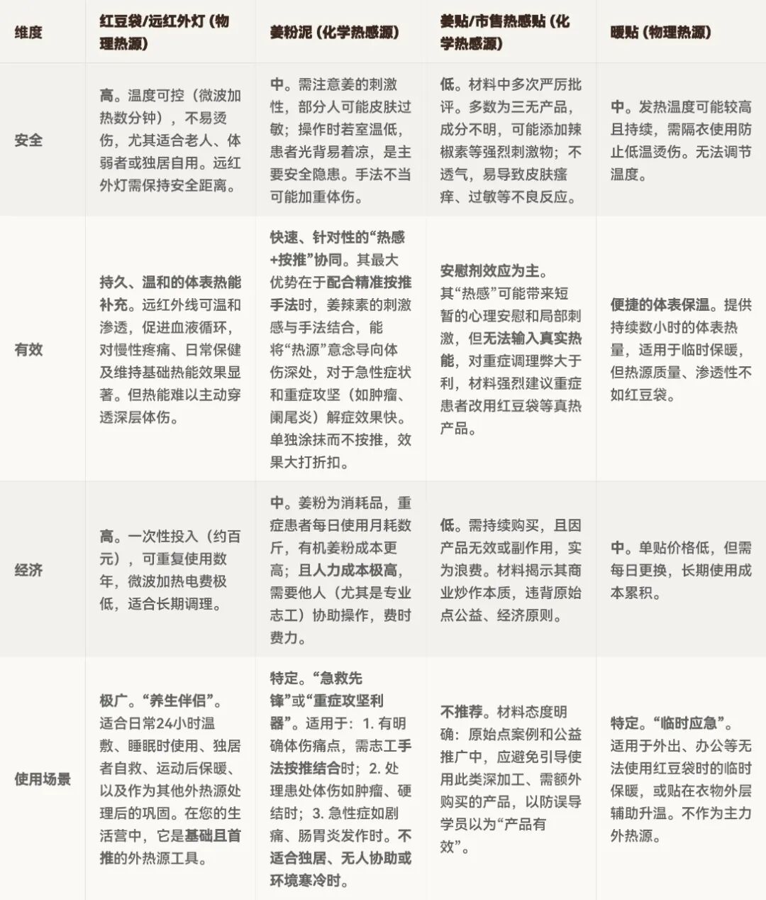 维度 红豆袋/远红外灯 (物理热源) 姜粉泥 (化学热感源) 姜贴/市售热感贴 (化学热感源) 暖贴 (物理热源)