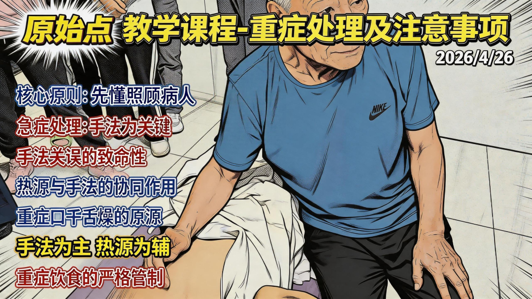 总结:学原始点的核心是学照顾重症患者,手法是核心中的核心,需配合热源、饮食管控、日常保养,才能做到利己助人。 -