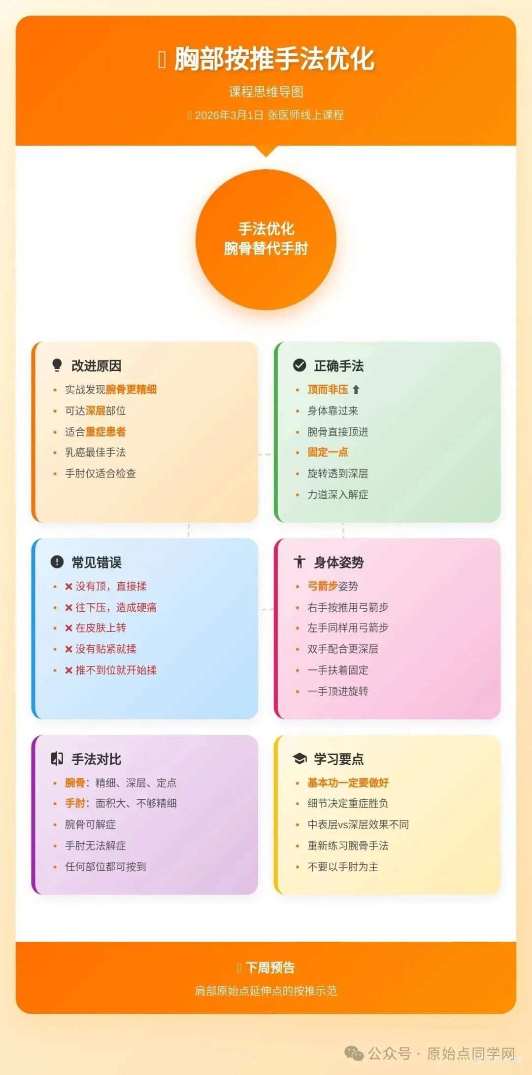 - 注:原文中该部分表格重复刊载两次,表述完全一致 对比项 2026年4月26日最新课程 2026年3月临时学习版 差异说明 重症主次关系 手法为主,热源为辅(手法解决体伤,热源辅助渗透) 热源为主,按推为辅(热源解决体伤,按推配合) 最新课程明确纠正早期错误认知,主次完全颠倒 急症核心 手法为唯一核心,热源无效 未明确强调急症手法的决定性地位 最新课程强化急症手法的生死作用 痊愈标准 压痛点完全消失为金标准,附张医师亲身案例佐证 仅提及「压痛点无痛为康复标准」 最新课程补充了实操判断依据 工具选择 明确腕骨为胸部、乳癌等精细部位首选,优于手肘 未明确腕骨的场景优先级 最新课程细化了工具适配规则 伤口处理 创口不清洗、不包扎,仅洗周围渗出液 未明确伤口处理细节 最新课程补充了重症伤口护理规范 补充参考来源 2026/3/29 胆管癌实作教学、2026/3/22 乳癌实作教学、2025/12/28 患处优先课程。 文章来源微信公众号: 原始点同学网