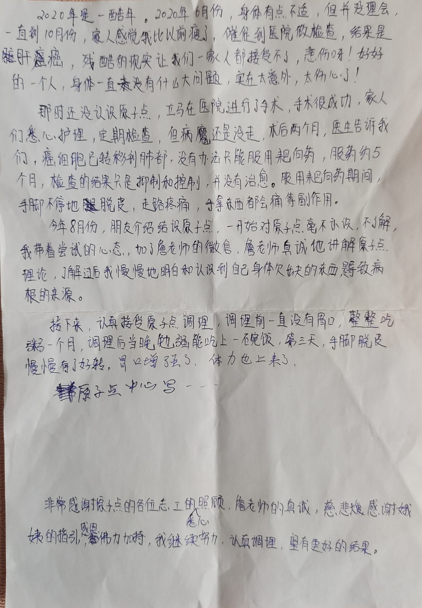 我在2019年9月被检查出肝癌,在当地最好的医院医治,做介入手术两次,并服用抗肿瘤药。随后到全国最好的外科医院做放疗和辅助性治疗,结果肝肿瘤有缩小。 2020年4月底复查,不料却已转移肺部。2020年5月,呼吸困难日益加重,感觉自己的生命即将结束。 百思不得其解:为什么到如此好的医院治疗,仍然不能治好,反而恶化?这让我感到非常绝望。 由于治疗不见效果,曾接触过原始点医学的亲友多次劝导我尝试使用原始点。起初对原始点不了解和不相信,但是每天在家心情烦躁、绝望,心里想着也许只有一个月的生命了,因此决定尝试。 于是在2020年6月4日,我来到原始点公益中心进行调理。 调理细节 1.按推:刚开始按推时全身都是痛点,觉得非常难受。...