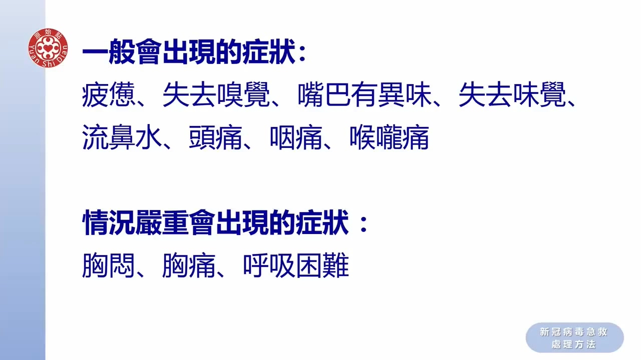 新冠肺炎病毒急救处理方法 最好 最快步骤 1按推上背部/薑粉喷鼻2.按完 塗薑粉泥3.電热器温敷4.吞服姜粉泥,温热饮食。避寒凉药食。温暖舒服环境。 也可在 第二步骤2 制作姜粉泥涂抹前,先吞服两口 世界加油加薑 肺炎案例视频 原始点处理新冠肺炎确诊患者实作分享(达拉斯) 60岁http://www.cch-foundation.com/case/xgfy/42.html 【新冠病毒经历】 2020年10月16日,身体开始感觉不舒服,像是感冒了,发烧发热、身体怕冷、干咳、流鼻涕。 第二天早上起来,身体更不舒服了,比前一天严重,就没去上班,在家休息。 表现的症状是乏力、干咳、流鼻涕、冒冷汗、身体怕冷,当时没量体温。 因为学过原始点,在生活中也有落实。...