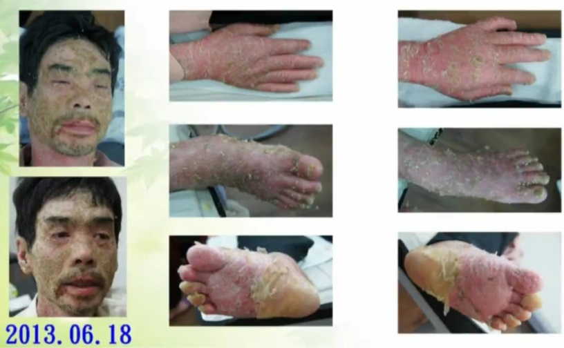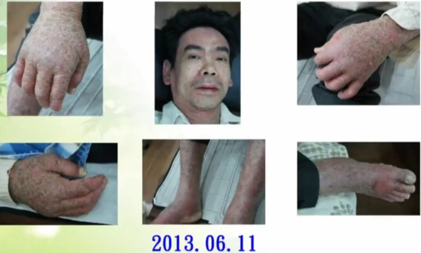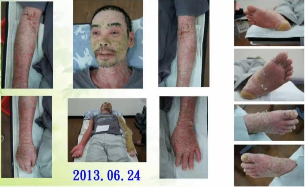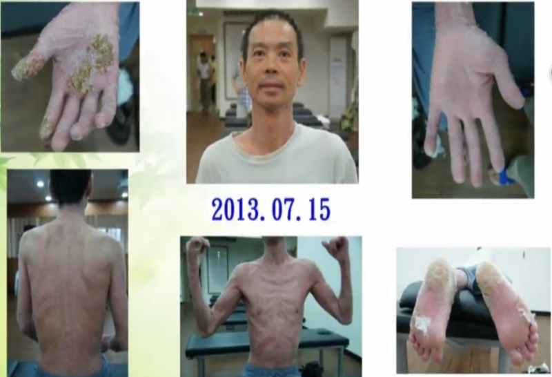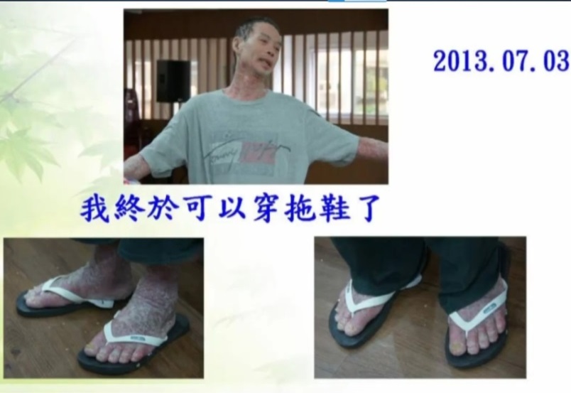 这个西医是没有办法了。他跑过很多,也是从美国过来,整个情况大家也看到了。我看到这一个影片,我还蛮感谢基金会所有志工同仁的付出,因为他说他连住旅社,旅社都不敢收他,因为怕他身体整个很脏,他掉屑屑,竟然也有志工帮他收留,听说甚至把他主房给他睡,主人是睡在客房。那这样地照顾他。所以一件事的成功背后都有怎么样,很多的因缘,所以很多志工的努力,他才可以。因为来基金会的时候,他几乎是没什么力,走路都很难,寸步难行这样。好,那这是第一个案例。这个是不是难治?(是)不好玩。刚刚在擦的那个是姜泥,后面我们会讲到。就是剁碎,他有伤口有时候用姜粉撒,还有他常常全身撒的那个都是姜泥,切碎。姜泥撒下去整个循环会加速。要不然他也不能揉,他那个皮肤很薄,一揉常常就破。所以在治疗他确实是遇到很多瓶颈,一点一点,志工克服下来,才有这样的成果。好,那我们第二个案例,放张彩香那个36年的帕金森。你们知道帕金森吗?手脚抖。但是她不善于拍,没有把拍的时候说出来。因为来的时候手脚都会抖。治疗一段时间手脚不抖,那之后她就接着叙述她后面的整个情况。好,我们现在来欣赏。