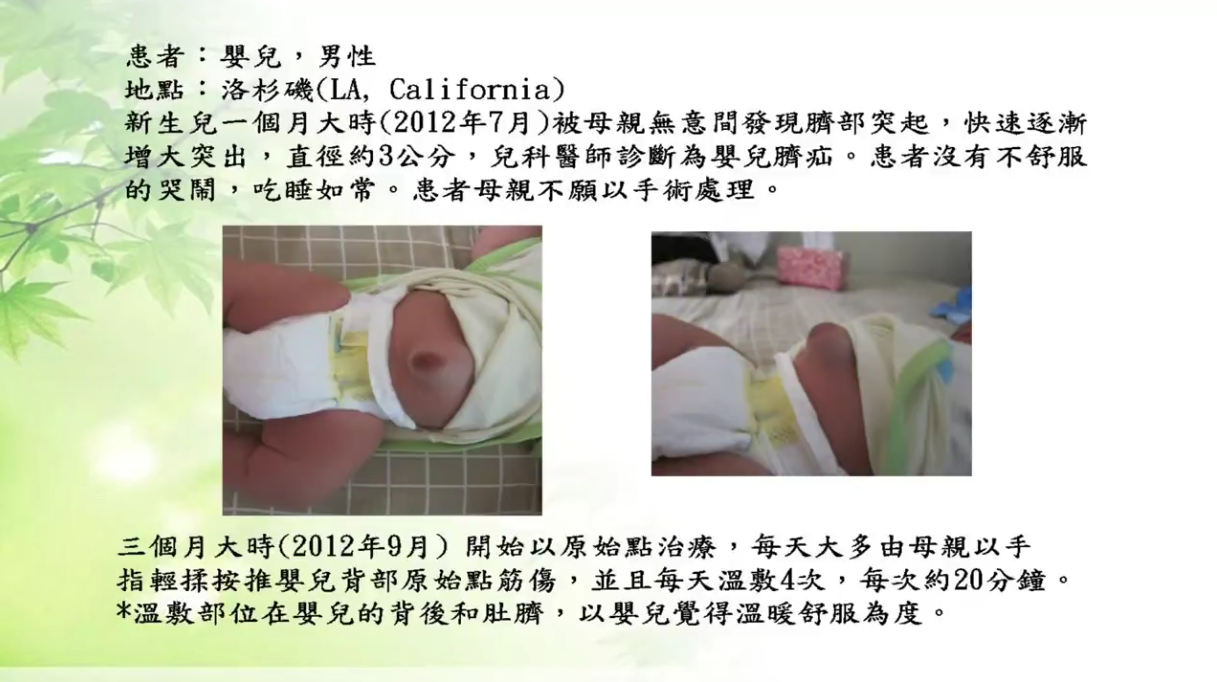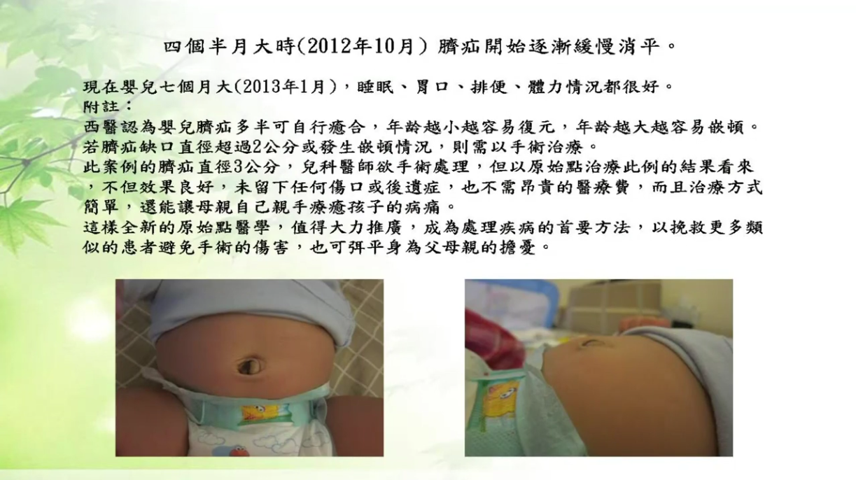此案例的脐疝直径3公分,儿科医师欲手术处理,但以原始点治疗此例的结果看来,不但效果良好,未留下任何伤口或后遗症,也不需昂贵的医药费,而且治疗方式简单,还能让母亲自己亲手疗愈孩子的病痛。