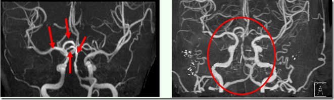 MRI核磁共振影像显示,实体白色区段为血管堵塞处。