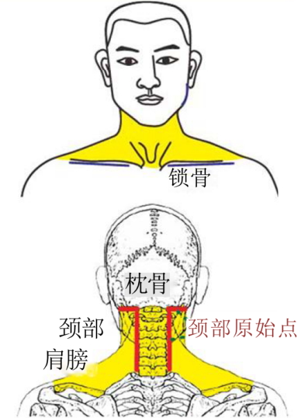 它的原始点在图上大家看得很清楚,就是红线的部分。所以枕骨下沿两排到整个颈椎,它管理的部位就是黄色的部位,那所以涵盖范围你们一看就知道。只要按这个红线,它管理的部位有多大的范围,那这个一定可以管理得到。因为这个都是长期做下来,所以一般肩膀痛应该要揉哪里?从枕骨下沿揉看看,一般都在枕骨下沿。那揉一揉这里反而会松,然后在颈椎也找找看。