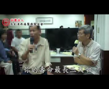 你的寿命最长三天啦,用这种方式,活着的人被这样讲对吗?心整个都乱了。第二间我再来试试看, 我将资料复制带过去,第二间讲话就留一些后路,可能差不多三个月,但是我走之前,我不知道他又叫我小孩与太太偷偷摸摸进去,医生说他要注意,他说可能应该不会超过一个月喔。第三间去也说,经过这二间我看我这边也差不多啦。我想竟然是这样,你说最后我想也对,干脆我问这个你告诉我生存的机会到底有几成这样就好。他说一成的机会都没有,他说你这种情况最好是赶快处理,准备明天送进加护病房。人都还未怎样就送进加护病房。我说不要。药啊什么药都不吃,送进病房也不吃。到目前正月十二至今我觉得身体越来越硬朗。