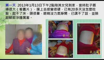 第一天2013年1月13曰下午2点陪其女儿到家, 当时肚子胀得很大(看图片),摸上去感觉很硬,已经20多天没怎么吃饭,起不了床,头很晕眼睛没力气睁开,已讲不了话,并脸部脚部浮肿厉害。