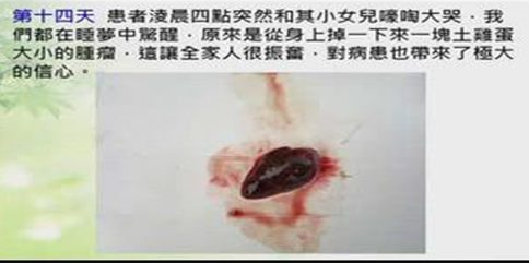 第十四天患者凌晨四点突然和其小女儿嚎啕大哭,我们都在睡梦中惊醒,原来是从身上掉下来一块土鸡蛋大小的肿瘤 ,这让全家人很振奋,对病患也带来了极大的信心, 大约二十天后,妈妈因体力不继,脸色红润 身体柔软,安祥的往生了。