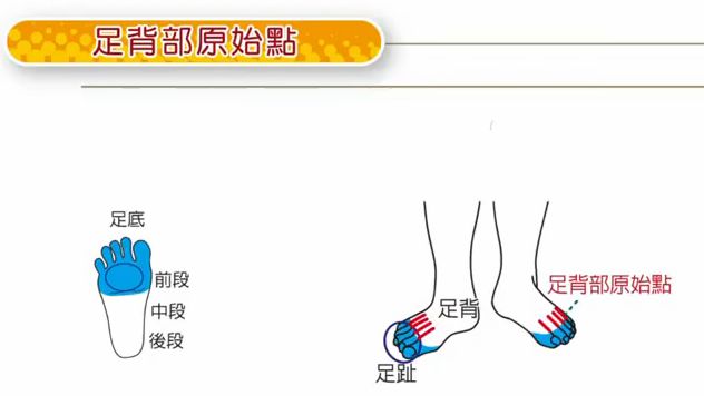 足背原始点就是管理脚趾头上面。那个骨缝旁的蚓状肌,这里,它管理哪里呢?脚趾头,还有管理足底前段痛。那它怎么对应呢?就是红线的近端处对到脚底就是它的极限。那以下的统统是它管的。这样清楚了。好,那我们再看手的部分。