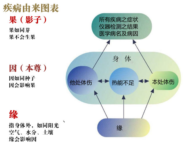 好。那我们把身体当做是因,我们直接来看我们的图表。这样来讲述会比较有一个概念。下面的那个图表,因缘果的图表,你看这个整个是身体对不对?中间这一圈。那身体是属因。为什么我说身体是因呢?你们说生病生病,是身体生出来的病对不对?那身体是因,生出来的病叫什么?果。一定要有一个因才会有一个果。我问各位你们是怎么生下来的?是石头蹦出来的吗?还是无中自己生有了呢?还是自己生自己的?有没有这一回事?(没有)没有。那你一定是从哪里生出来?母亲生出来对不对?那母亲就是什么?你的因,对不对?把你生出来,你就是母亲的果。好,同样身体如果是因,那你从身体以后生出来的病叫什么?果。那身体就是因。那果要怎么样才能生出来呢?因坏。因也就是你身体使用久了,热能不够了,他处体伤了或本处体伤,那慢慢就会形成症状,它是这样来的。所以我们说身体是因,因坏可分体伤及热能不足,就是在中间这里,体伤又分他处体伤跟本处体伤。那我今天也做给大家看了。如果揉了有效,我都是从他处找的还是本处找的?他处找。所以揉出来的一定是他处体伤。即便像刚刚最后一个那么严重,她全身都在痛。我是从他处还是本处揉的?(他处)他处。她膝盖痛我没有揉膝盖。她小腿痛我没有揉小腿肚,但我揉上面她下面就改善了。所以她还问我:我好像下肢还没有处理怎么改善了?就是这样。因为上面是因,下面是果,是这样来的。那上面是体伤所在。