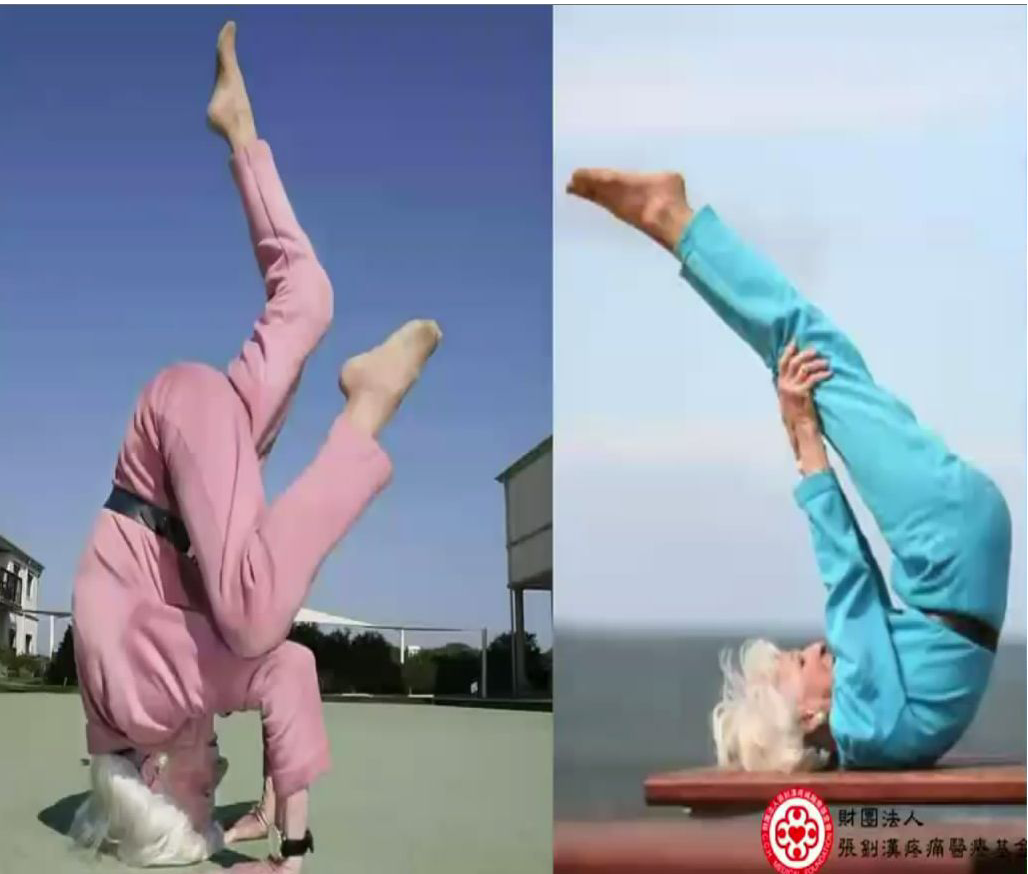 已练习和教授瑜珈40余年,虽然已85岁,但仍然能够做高难度动作。